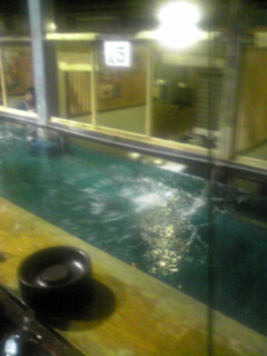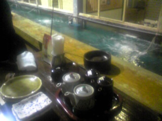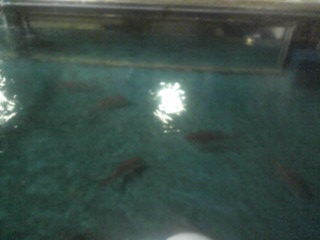 このお店と特徴としてお店に釣り堀があって、自席から釣りができるんです。 こんなカンジ。 で、釣った魚は買い取りになるんですけど 一匹丸ごとですから釣った魚によっては 一部お造りにして、一部塩焼きやから揚げにして、アラをお味噌汁にして 最後はお茶漬けにもできちゃったりするフルコースなんかもお願いできちゃうわけです。 で、本来たとえば一匹丸ごとフルコースだと 高い魚で4,000円くらい、アジとかで800円くらいするんですけど それが自分で釣り上げると2割引きくらいで食べられるんです。 魚はタイ、シマアジ、ヒラメ、アジ、伊勢海老(笑)などなど。 あとはゼッタイ釣れないんでしょうけど、なぜかネコザメもいました(笑)