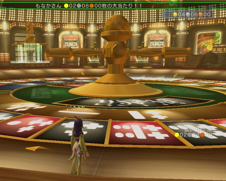 ・・・おまけ・・・ PSU復帰記念、ということで 最初はただ今日の分のカジノコインを回収しに来ただけなのに 何となくルーレットをやってみようかな、ということになりました。 現在の持ちコインは3金4銀。 以前のイベントのときに全賭けしてどうにか勝ちましたので、その名残です。 で、さすがに全部賭けるのはまずいので (ワタシいない間に何か景品に貴重品が追加されてるとも限らないし) とりあえず1金4銀を賭けることにしました。 もし失敗しても手元にはまだ2金残るので それを全賭けすればまだ取り返せます。 で、賭けてみたんですが・・・ よく見るとコインにキングラッピーらしき肖像があったんですねw そして結果ですが。